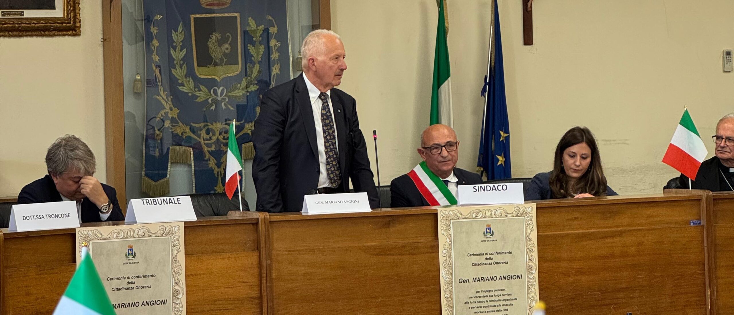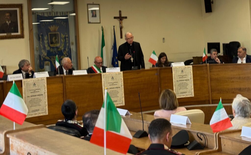 In un’aula consiliare gremita di autorità, cittadini e studenti, il Comune di Aversa ha conferito la cittadinanza onoraria al Generale Mariano Angioni, capitano dei Carabinieri ad Aversa nel periodo 1987-1992, figura simbolo dell’impegno delle Forze Armate nella tutela della legalità e di coraggioso impegno nella lotta contro la camorra. Alla cerimonia ufficiale, svoltasi presso la sede del Consiglio comunale, hanno preso parte il Vescovo, mons. Spinillo, il Presidente del Collegio del Tribunale del Riesame dott.ssa Annalisa De Tollis, per il Tribunale di Napoli Nord il dott. Buono, l’ex Presidente del Tribunale dott. Picardi, la dott.ssa Troncone, il Procuratore F.F. Della procura di Napoli Nord dott.ssa Lucchetta, il procuratore aggiunto dott.ssa Maria Di Mauro, i vertici dell’Arma dei Carabinieri, Col. Pasquale Sasso Iovene, ten. col. Ivano Bigica, il luogotenente Silvestro Verde, la Direttrice del carcere di Aversa Stella Scialpi, il generale Massimo Cagnazzo, il generale Di Mauro, il sen. Pasquale Giuliano, l’on. Paolo Santulli, rappresentanti della scuola Nunziatella, Magistrati, associazioni del territorio e delegazioni delle scuole locali, in un clima di grande partecipazione ed emozione.