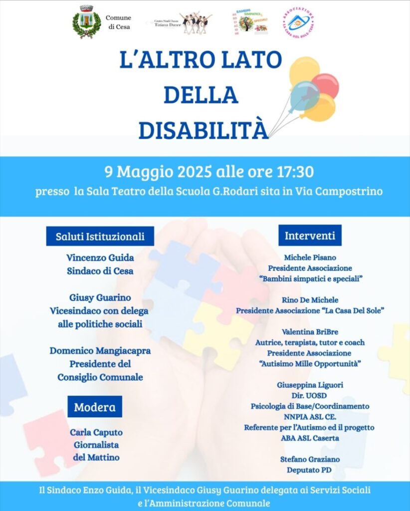 In collaborazione con le associazioni del territorio, il Comune di Cesa ha organizzato l’evento “L’altro lato della disabilità”. L’iniziativa si terrà venerdì prossimo (9 maggio) alle ore 17:30 presso la sala teatro della scuola Rodari in via Campostrino. Oltre ad affrontare il tema dell’inclusione e della sensibilizzazione sul tema dell’autismo, ed in generale della disabilità, il confronto ha l’obiettivo di affrontare “l’altro lato della disabilità”, cioè il ruolo del “cargiver”: con la diagnosi non cambia la persona con disabilità, bensì la famiglia ed il modo di affrontare la quotidianità. Il convegno vuole essere un punto di riflessione su come aiutare e sostenere i genitori (cargiver) ed offrire loro forza di accettare l’inaccettabile coraggio di andar avanti e vincere la battaglia.