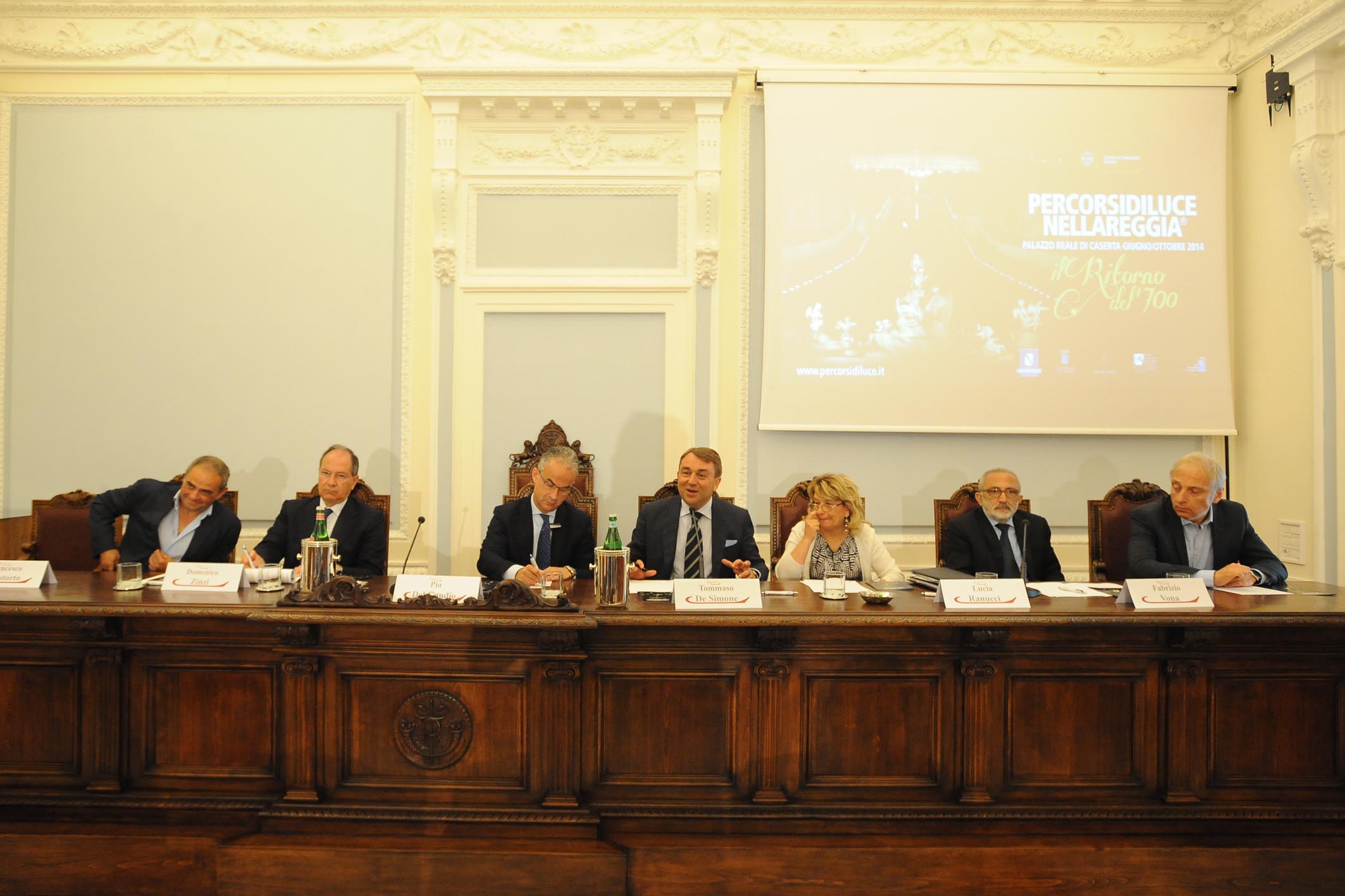 “In un periodo economico di certo non facile, abbiamo voluto investire ancora una volta nella speranza di rilancio e prestigio che questa terra merita. E lo abbiamo fatto con la forza delle oltre 6mila imprese del settore del turismo e le oltre 100mila della provincia che rappresentiamo, puntando su una carta vincente: i Percorsi di Luce alla Reggia di Caserta, richiesti a gran voce dal pubblico e da tutte le associazioni di categoria del territorio”. Con queste parole Tommaso De Simone, presidente della Camera di Commercio di Caserta, ha inaugurato questa mattina l’incontro con la stampa per la presentazione dei “Percorsi di Luce nella Reggia … il ritorno del ‘700”, al via dal prossimo 21 giugno. “Dimostriamo concretamente che “fare rete” si può e si deve – ha aggiunto De Simone – soprattutto in periodi di magra, e che il rilancio di un territorio che punta sul turismo di qualità e dei grandi numeri merita la sinergia e la volontà di collaborare che tutte le istituzioni del territorio ci stanno dimostrando”. Tra le iniziative indicate dal presidente De Simone, lo sconto di 6 euro riservato a coloro che esibiscono il biglietto “Percorsi di Luce 2014” presso tutte le pizzerie e i ristoranti convenzionati . Voglia di collaborare condivisa da tutti i rappresentanti istituzionali invitati al tavolo dei relatori questa mattina, tra i quali il presidente della Provincia Domenico Zinzi che ha rimarcato l’importanza di iniziative che non si lascino arenare nella palude delle incertezze politiche e delle lungaggini burocratiche per l’accesso ai fondi. “Sarà mia premura sottolineare al Ministro ai Beni Culturali Franceschini – ha dichiarato il sindaco di Caserta Pio Del Gaudio – che ancora una volta la città per la Reggia c’è, in attesa che anche lo Stato concretizzi gli impegni assunti per il recupero e il rilancio del monumento”. Attività in fermento per i Percorsi di Luce 2014 anche tra le mura della Reggia, tra gli uffici del Polo museale e dell’Ente Provinciale per il Turismo di Caserta, pronti a promuovere iniziative di promozione che rendano il “pacchetto Percorsi” ancora più appetibile. Tra queste, al vaglio del Comune di Caserta la possibilità di applicare sconti del 50% sul ticket di visita al Belvedere di San Leucio riservato a coloro che esibiranno il biglietto dei Percorsi di Luce. Le ultime battute dell’incontro con la stampa sono state del direttore artistico Francesco Capotorto che poco ha voluto rivelare sulla nuova edizione della kermesse by night alla Reggia: “Sarà un viaggio che attraverserà un sogno, quello del Vanvitelli, fino alla sua concretizzazione, la Reggia. E il ‘700 si racconterà su un tappeto musicale contemporaneo attraversando il cuore massonico voluto dalla regina Maria Carolina nel ventre del Regno di Napoli”.