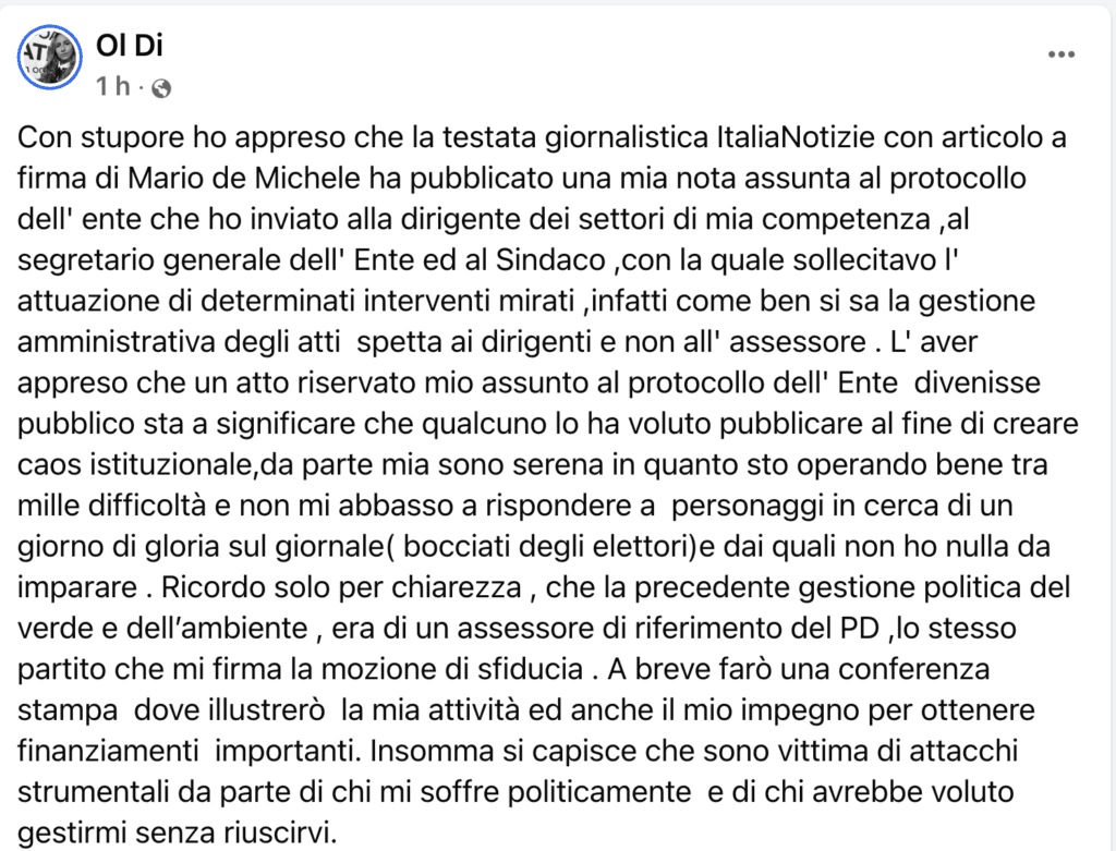 Leggendo il suo post su Fb il gioco di parole è inevitabile: apprendiamo con stupore lo stupore con cui Olga Diana ha appreso della pubblicazione su Italia Notizie di una sua nota indirizzata al dirigente dell’area tecnica Danila D’Angelo e per conoscenza al sindaco Franco Matacena e al segretario generale Emanuela De Chiara (clicca qui, foto e link in basso). Ci stupisce, in prima battuta, che l’assessore definisca la sua iniziativa “un atto riservato”. Sul piano strettamente amministrativo l’esponente della giunta dovrebbe sapere che una comunicazione protocollata assume sempre una natura pubblica. Il profilo della segretezza si potrebbe configurare, a rigor di legge, soltanto nel caso della diffusione di eventuali dati sensibili da “oscurare” per motivi di privacy. Non è il caso di specie.