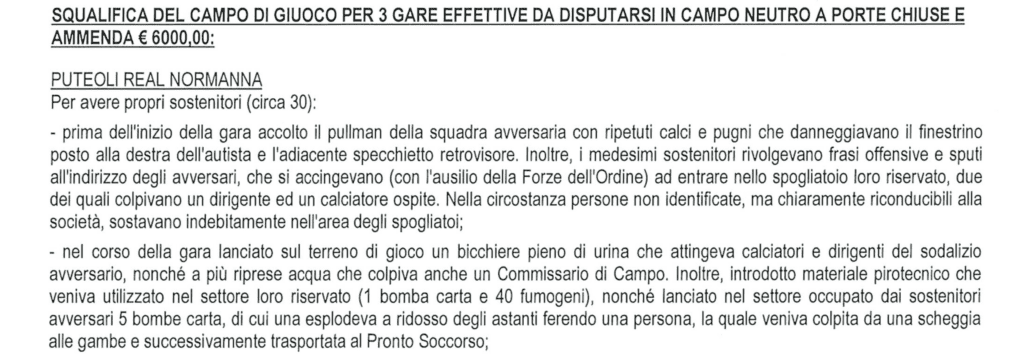 La sanzione adottata dal giudice sportivo Aniello Merone è pesante. La società guidata dal presidente Enzo Del Villano e dal presidente onorario Mimmo Diana potrà fare ricorso. Ma quella che va stoppato, senza se e senza ma, è la piccola frangia di delinquenti abituali che con il loro comportamento ledono l’immagine della Real Normanna e della città di Aversa. Non è la prima volta che un gruppuscolo di malviventi trasforma una partita di calcio in una corrida. È ora di mettere il punto. Di chiudere questo capitolo con intransigenza. Nessun giustificazionismo, nessuna difesa d’ufficio. Il messaggio sarebbe catastrofico. Significherebbe dare cittadinanza sportiva a chi non merita nemmeno quella italiana.