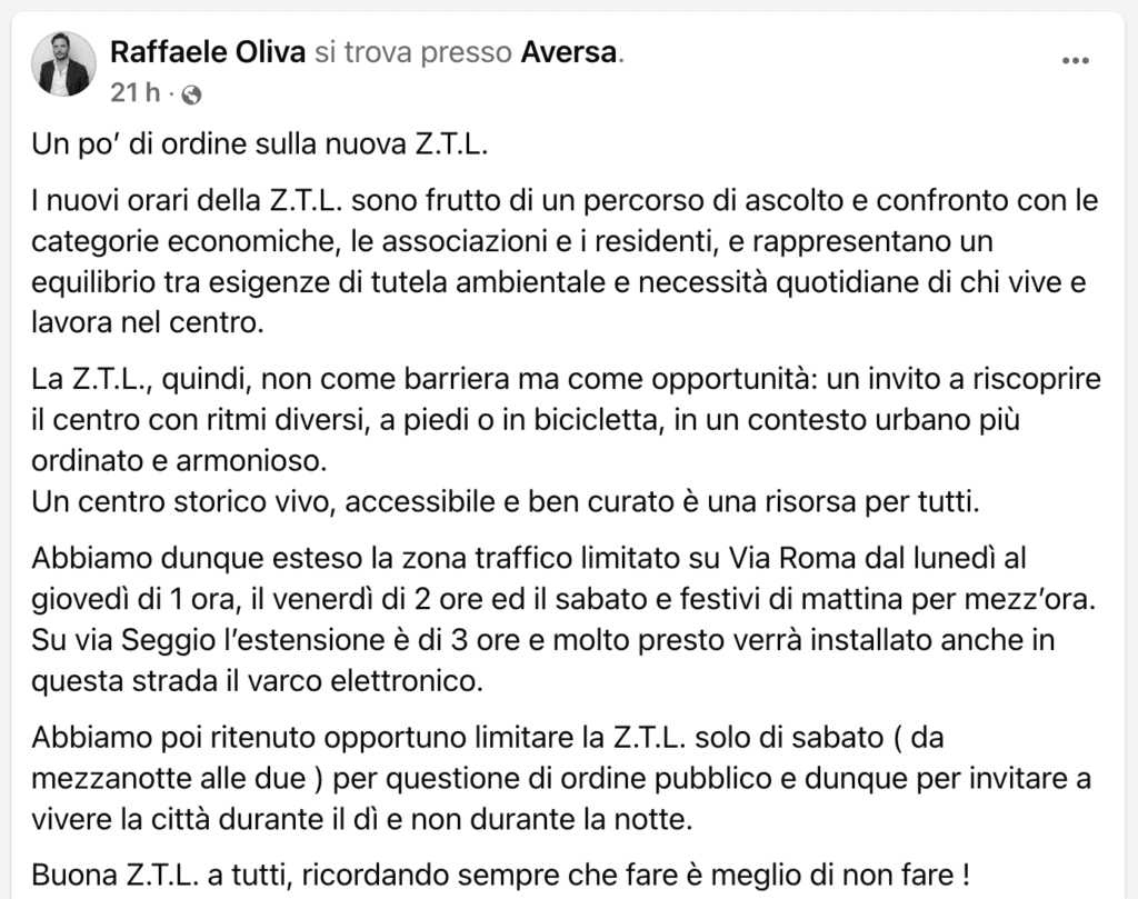 Chi è l’ideatore della “vuota propaganda sugli orari” a cui fanno riferimento gli esponenti de La Politica che serve? Ce ne sono tanti, visto che da poco sono stati “attaccati” i manifesti con la faccia e gli slogan di Matacena guarda caso proprio sulla Ztl. Ma il primo indiziato è il consigliere di Immagina Aversa Raffaele Oliva, che ieri (2 maggio), dopo l’adozione della seconda ordinanza del sindaco, ha pubblicato un post Fb intitolato: “Un po’ di ordine sulla nuova Z.T.L.” (foto in basso). Già in partenza, per un intrinseco conflitto di interessi, il componente della maggioranza dovrebbe maneggiare con estrema cautela la tematica della Ztl nel centro storico. Oliva è proprietario o comproprietario di due apprezzati locali per la somministrazione cibi e bevande e per attività di vicinato, uno in via Roma, l’altro in via Seggio. Ne consegue, per ovvi motivi, che gli orari della Ztl incidono in meglio o in peggio sulle sue attività commerciali. Ma, al netto dell’aspetto economico, il post del consigliere di Immagina Aversa è scorretto sul piano politico-amministrativo. Per fare davvero “ordine sulla nuova Ztl” avrebbe dovuto scrivere che, con la seconda ordinanza, Matacena ha recepito una buona fetta delle richieste di De Michele. Per usare le parole di Oliva sicuramente “fare è meglio di non fare”, ma non c’è nulla di male ad ammettere che ciò che si è fatto è merito dell’opposizione. Non fosse altro perché uno dei suoi due locali si chiama “Veritas”.
