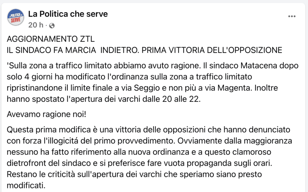 Il comunicato dell’esponente de La Politica che serve è del 30 aprile. Arriva in redazione in tarda mattinata. I manifesti vengono affissi verso le 11 dello stesso giorno. Battiamo con insistenza sulle date per ricostruire gli eventi con l’orologio della verità. Appena due giorni dopo, il 2 maggio, Matacena torna sui suoi passi e adotta un’altra ordinanza con lo stesso oggetto di quella precedente, varata il 23 aprile: “Zona a Traffico Limitato del Centro Storico a controllo automatizzato: modifica degli orari di esercizio”. Il nuovo provvedimento accoglie in gran parte le istanze di De Michele. Sulla pagina Fb de La Politica che serve se ne prende atto con soddisfazione. “Sulla zona a traffico limitato abbiamo avuto ragione. Il sindaco Matacena ha modificato l’ordinanza sulla zona a traffico limitato ripristinandone il limite finale a via Seggio e non più a via Magenta. Ovviamente dalla maggioranza nessuno ha fatto riferimento alla nuova ordinanza e a questo clamoroso dietrofront del sindaco e si preferisce fare vuota propaganda sugli orari” (foto in basso).