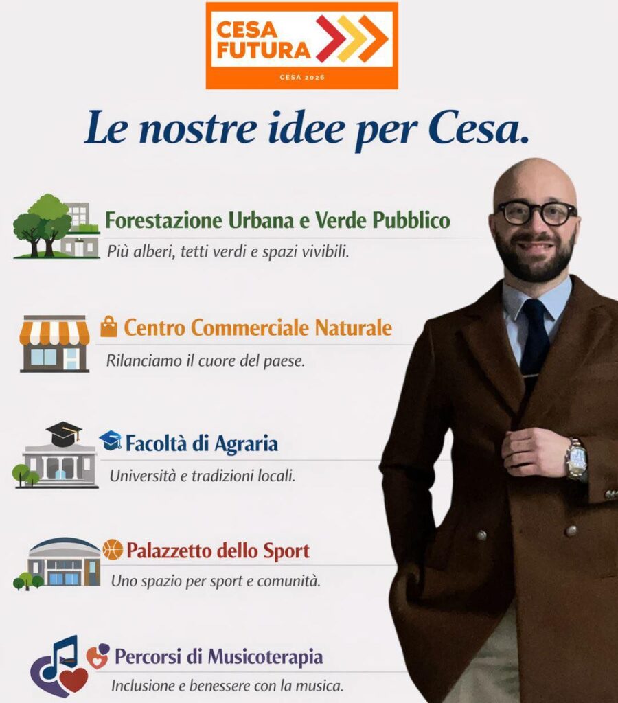 Grande attenzione anche per l’ambiente attraverso l’adozione di “piano di forestazione urbana e valorizzazione del verde pubblico, con la piantumazione di alberi e la realizzazione di tetti verdi sugli edifici comunali, per migliorare la qualità dell’aria, ridurre il calore estivo e rendere Cesa più vivibile”. Un altro punto programmatico importante riguarda “il rilancio economico del centro cittadino attraverso la creazione di un centro commerciale naturale lungo corso Umberto I, mediante la collaborazione tra comune e proprietari dei locali sfitti e incentivi per favorire l’apertura di nuove attività e sostenere giovani imprenditori”. Infine Cesa Futura propone un’iniziativa sociale innovativa con “l’introduzione di percorsi di musicoterapia, realizzati in collaborazione con le associazioni musicali locali e con i maestri diplomati al conservatorio presenti sul territorio, utilizzando la musica come strumento di inclusione, benessere e supporto alle fragilità”.
