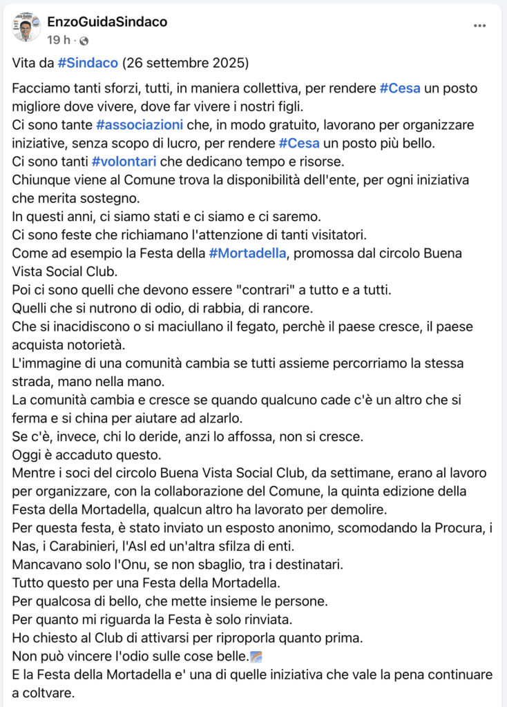 Mai come stavolta saremo concisi. Fulminei. Perché non servono fiumi di inchiostro per commentare una vicenda nitida come il cielo d’agosto. Un secondo dopo l’annuncio del circolo Buena Vista Social Club dell’annullamento della Festa della Mortadella, in programma stasera in piazza De Michele a Cesa, il sindaco Enzo Guida si è fiondato su Fb, dove ogni santo giorno trascorre, beato lui, molto tempo, per riproporre la stantia narrazione di regime di fantomatici spargitori d’odio che non vogliono “coltivare cose belle”. Nell’immancabile post quotidiano la fascia tricolore ha alimentato la solita incultura del sospetto.