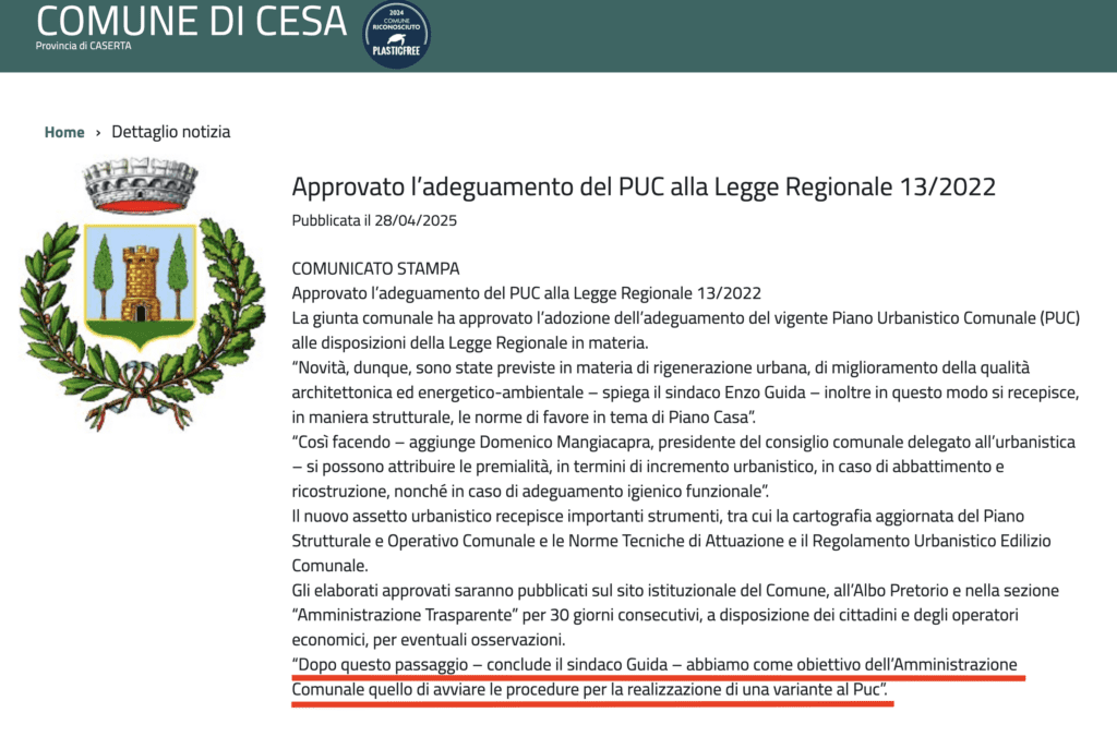 Gratta, gratta ed ecco affiorare un barlume di verità. “Abbiamo come obiettivo dell’amministrazione quello di avviare le procedure per la realizzazione di una variante al Puc”. Lo ha dichiarato Enzo Guida tramite una nota pubblicata sul sito ufficiale del comune di Cesa (foto in basso). Alla fine della fiera il sindaco ha ammesso, senza fare ammenda, che per la cosiddetta “rigenerazione urbana” del territorio, inclusa quindi la “riconversione” delle case-ufficio, è necessario mettere mano allo strumento urbanistico. È quello che andiamo dicendo e scrivendo da mesi. Altro che inesattezze o notizie false. La fascia tricolore è venuta a dama. Non per farci un favore, si intende, ma perché il decreto “Salva Casa” di Salvini è chiaro: i cambi di destinazione d’uso non possono essere autorizzati per gli immobili che ricadono, come nel caso di Cesa, nelle zone D, destinate ad attività produttive. Non serviva Renzo Piano per comprendere l’ovvio. Le aree D sono sottoposte a parametri volumetrici totalmente diversi rispetto a quelle residenziali. Nelle zone per le attività produttive il parametro volumetrico riguarda l’altezza, la distanza dai confini e la superficie da occupare. Negli insediamenti di carattere commerciale e direzionale a 100 mq di superficie lorda di pavimento di edifici previsti deve corrispondere la quantità minima di 80 mq di spazio per standard urbanistici, escluse le sedi viarie, di cui almeno la metà destinata a parcheggi.