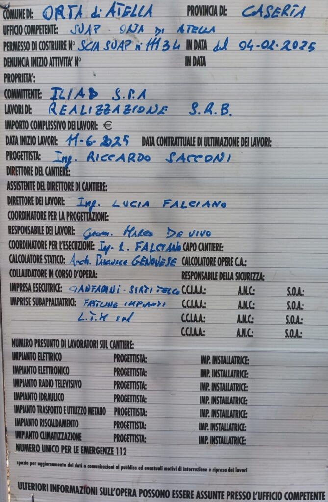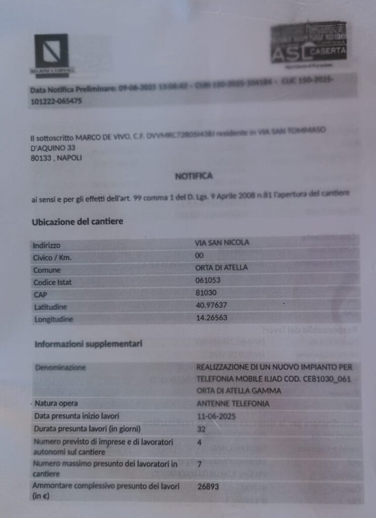Anche in questo caso, come per l’antenna sorta a pochi metri dall’asilo Don Milani, gli amministratori locali se ne stanno lavando le mani con il solito scaricabarile: “Nulla saccio, nulla vidi… e se vidi, nulla sentii”. Ma come e perché il comune ha concesso l’autorizzazione all’Iliad? Il permesso è stato dato nuovamente con il silenzio-assenzo? Sarebbe scandaloso se si replicasse in modo identico ciò che è avvenuto pochi mesi fa per il ripetitore nel parcheggio del Fabulae. E stavolta l’eventuale inconsapevolezza del sindaco Antonino Santillo e degli assessori sarebbe non solo inaccettabile ma la dimostrazione plastica dell’incapacità di governare la città. Lo scorso 9 giugno è stato notificato all’ente locale l’ubicazione del cantiere con l’indicazione dell’inizio dell’opera nella giornata di oggi e con una durata presunta di 32 giorni (nella foto in basso). Il progettista è l’ingegnere Lucia Falciano, mentre il responsabile dei lavori è il geometra Marco De Vivo. La ditta esecutrice è la Cianfarani Sirti Telco (nella foto in basso). A quanto pare, ma non ne siamo certi, il terreno individuato sarebbe classificato nel Puc come area destinata a parcheggio pubblico. I proprietari sarebbero una famiglia del Napoletano.