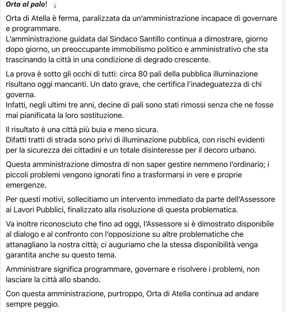 Nel frattempo, dopo 3 mesi di letargo, si svegliano i consiglieri Nicola Margarita e Antonio Sorvillo. Gli esponenti di Fare Democratico hanno pubblicato su Fb un durissimo documento, che pubblichiamo integralmente in basso, contro Santillo e company. “Orta di Atella è ferma, paralizzata da un’amministrazione incapace di governare e programmare. La prova è sotto gli occhi di tutti: circa 80 pali della pubblica illuminazione risultano oggi mancanti. Il risultato è una città più buia e meno sicura”. Il gruppo politico-consiliare capitanato da Nando D’Ambrosio apprezza la disponibilità dell’assessore Chianese. “Va inoltre riconosciuto che fino ad oggi, l’Assessore si è dimostrato disponibile al dialogo e al confronto con l’opposizione su altre problematiche che attanagliano la nostra città”.