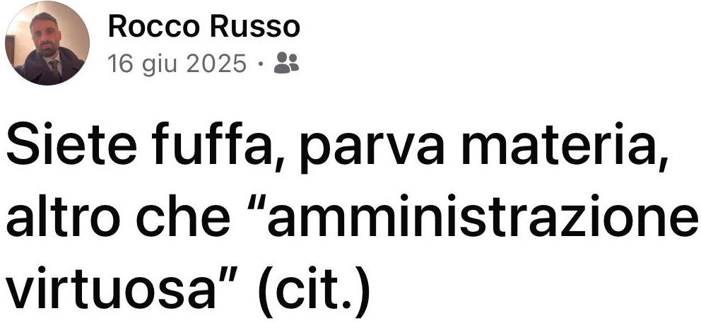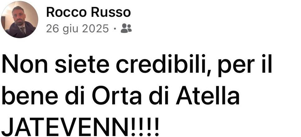 È il 16 giugno 2025. Russo posta su Fb il seguente post: “Siete fuffa, parva materia, altro che amministrazione virtuosa” (nella foto). Si potrà dire che si riferisse all’amministrazione di Bogotà. Invece no. Il 26 giugno 2025 scrive su Fb: “Non siete credibili, per il bene di Orta di Atella Jatevenn!!!!”. (nella foto). Il secondo commento toglie ogni dubbio. Sta parlando dell’amministrazione a trazione Santillo-Brancaccio. E “Jatevenn” è seguito da ben 4 punti esclamativi. Più categorico di così si muore.