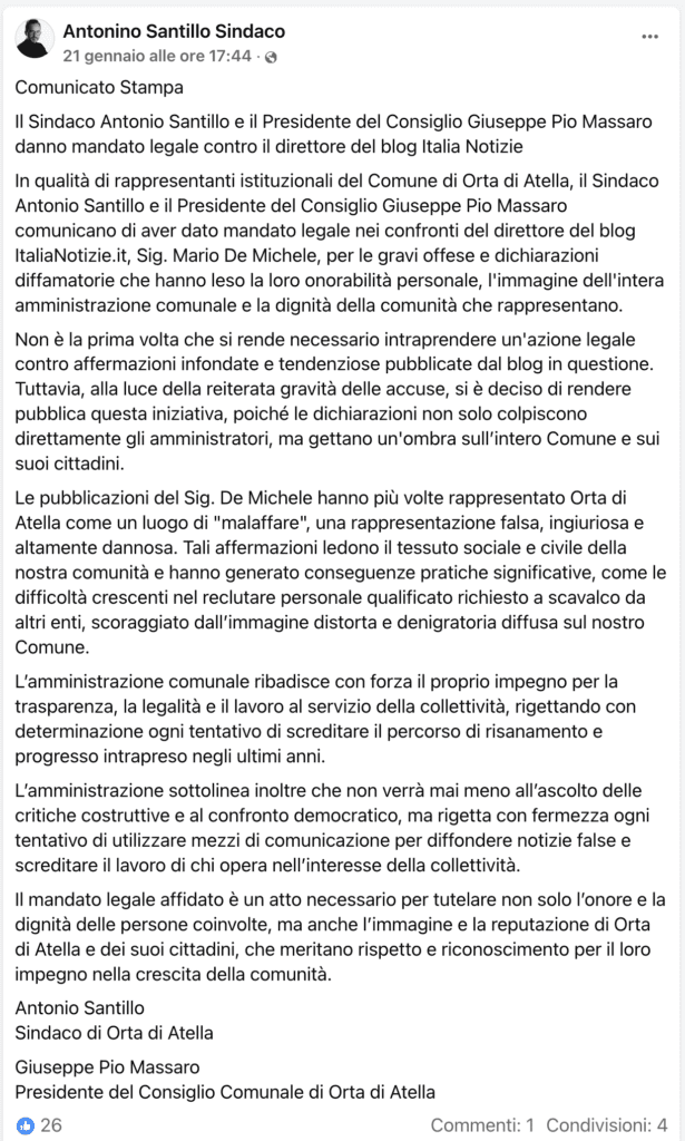 Tutti ricorderanno il “celebre” post del 21 gennaio firmato a quattro mani da Santillo e Massaro per annunciare la querela contro lo scrivente e Italia Notizie “per aver infangato l’immagine di Orta di Atella” (foto in basso). Ora che si stanno azzannando a vicenda e stanno facendo parlare della città in termini negativi in tutto il mondo dovrebbero avere la dignità di chiedere scusa. Non avverrà. Ma in tutta onestà facciamo volentieri a meno delle scuse del sindaco e del presidente dell’assise. Vorremo invece guardare le facce delle giornaliste “legalitarie” che si sono schierate con Santillo e Massaro attaccando Italia Notizie. Sarebbe vero spasso. Da quando hanno fatto “pendant” con la maggioranza le croniste d’assalto sono scomparse dalla circolazione. Non mancherà occasione di affrontare lo strano caso delle giornaliste filogovernative in terra ortese davanti agli organi preposti dell’Ordine della Campania.