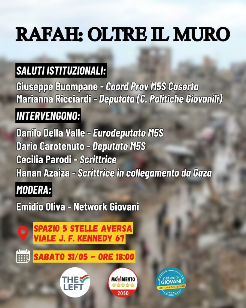 Sabato 31 maggio, a partire dalle 18:00, lo Spazio 5 Stelle di Aversa (Viale Kennedy 67) ospiterà l’evento pubblico “Rafah: Oltre il Muro”, organizzato dal Network Giovani e dal Movimento 5 Stelle di Aversa, per accendere i riflettori sulla drammatica emergenza umanitaria in corso nella Striscia di Gaza. Prenderanno parte all’evento l’europarlamentare Danilo Della Valle e il deputato Dario Carotenuto, da poco rientrati da una missione umanitaria al Valico di Rafah, al confine tra Egitto e Gaza. Con loro anche la scrittrice e attivista Cecilia Parodi e la giovane autrice gazawi Hanan Azaiza, che interverrà in collegamento diretto da Gaza per offrire una testimonianza viva e drammatica sul conflitto e sulla devastazione che sta colpendo la popolazione civile palestinese.
