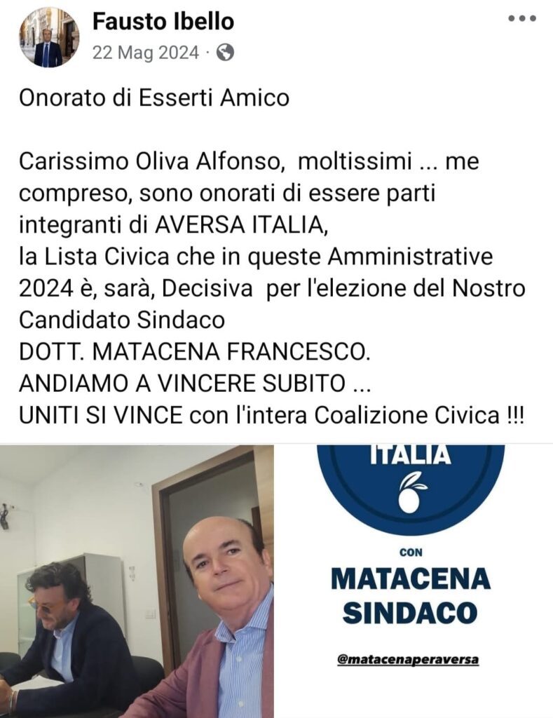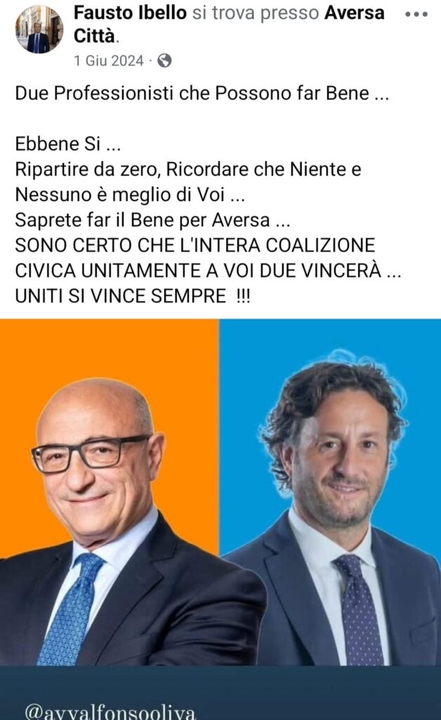 LO SPONSOR POLITICO DI IBELLO – Nel caso Ibello c’è lo zampino del Re Mida all’incontrario Oliva. L’avvocato, di fatto assistente al Rup in pectore, è un suo accanitissimo sostenitore, “parte integrante della lista Aversa Italia”, come lui stesso si definisce sui social (foto in basso). Tutti sanno e possono testimoniarlo che il suo nome è stato fatto da Oliva alla dirigente del settore Urbanistica Danila D’Angelo. Ibello è stato presentato come un avvocato di grido, come un professionista competente e integerrimo. È in prima fila per l’incarico diretto da 5mila euro di assistente al Rup con il compito di occuparsi del riconoscimento e delle liquidazioni dei debiti fuori bilancio. Settore “sensibile”. Un “sì” o un “no” alle richieste dei privati sposta voti, crea consenso. Inutile dire chi ne avrebbe beneficiato. Ma a un certo punto la dirigente D’Angelo cambia idea sul metodo di affidamento dell’incarico. Non più quello diretto, ma quello attraverso il Mepa. Come mai? Il nome di Ibello esce sui giornali e l’opposizione raddrizza le antenne. Se ne parla diffusamente perché è notorio lo strettissimo legame personale e politico tra l’avvocato e il vicesindaco Oliva. Nel frattempo si viene a sapere che Ibello è stato coinvolto in un’inchiesta sulle truffe alle assicurazioni. E se l’è cavata con la prescrizione (link in basso).