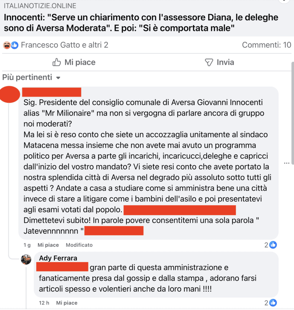 L’ultimo esempio di un team di governo abitato dai fantasmi dell’impolitica è incarnato da Adele Ferrara. La consigliera di maggioranza ha pubblicamente preso le distanze dagli alleati con due “uscite” Fb che lasciano a bocca aperta. Ricostruiamo i fatti. Il 15 aprile abbiamo pubblicato su Italia Notizie un articolo sul caso Olga Diana, ospitando le dichiarazioni di Giovanni Innocenti, leader di Aversa Moderata e presidente dell’assise (clicca qui). Dopo la condivisione social del pezzo, un cittadino ha scritto un post che definire al vetriolo è un eufemismo. Abbiamo oscurato alcuni passaggi perché fortemente diffamatori. Nel mirino è finito in particolare il presidente Innocenti. A fronte di accuse gravissime all’indirizzo della maggioranza, Ferrara ha postato il seguente commento: “Gran parte di questa amministrazione e fanaticamente presa dal gossip e dalla stampa, adorano farsi articoli spesso e volentieri anche da loro mani!!!”.