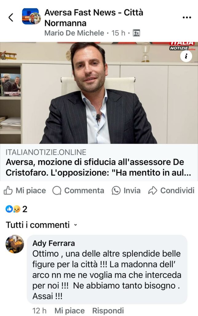 Incredibile. Un esponente della maggioranza che non solo non difende la sua coalizione ma addirittura condivide gli attacchi velenosissimi di un cittadino. Così, come se nulla fosse. Il bis di Ferrara arriva il 16 aprile, quando pubblichiamo il documento dell’opposizione che annuncia una mozione di sfiducia nei confronti dell’assessore Orlando De Cristofaro (clicca qui). Ecco il contenuto del commento della consigliera in calce al nostro post su Fb: “Ottimo, una delle altre splendide belle figure per la città!!! La madonna dell’arco nn me ne voglia ma che interceda per noi!!! Ne abbiamo tanto bisogno. Assai!!!” (link in basso).