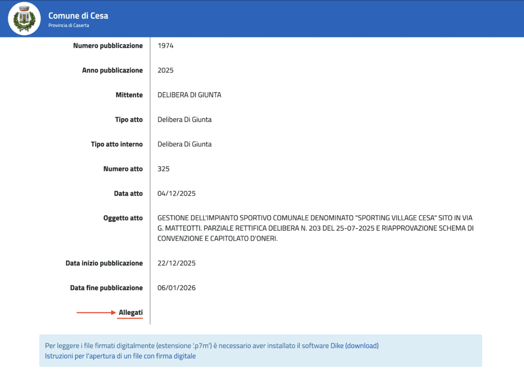 Dalla determina adottata da Giacomo Petrarca, responsabile del settore Lavori pubblici, si evince che in prima battuta la gara è andata deserta. Il capo dell’utc inoltre rimarca che “avendo rilevato delle incongruenze nello schema di convenzione e nel capitolato d’oneri approvati dalla giunta si è provveduto a riapprovarli con deliberazione della giunta n. 325 del 4 dicembre 2025”. Stranamente il provvedimento dell’esecutivo capeggiato da Guida, con il quale sono stati riapprovati lo schema di convenzione e il capitolato d’oneri, è privo di allegati. Per conferma basta consultare l’albo pretorio del comune. Ergo, non è possibile accertare cosa sia contenuto nei due importanti documenti (foto in basso).