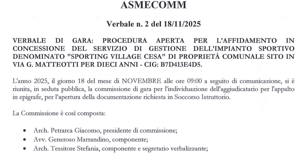 Il valore dell’affidamento ammonta a 1.420.000 euro. L’offerta minima annua, che già potrebbe bastare per il brindisi, è di appena 15mila euro. Moltiplicato per i 10 anni di assegnazione si arriva appena a 150mila euro in tutto. E poi ci sono i criteri di aggiudicazione dell’appalto. Sono basati quasi totalmente sulla discrezionalità della commissione. L’iter della gara per la concessione decennale ai privati dello “Sporting Village Cesa” è costellato da un lungo rosario di punti da chiarire e di scelte amministrative sbagliate e molto discutibili (link della determina in basso).