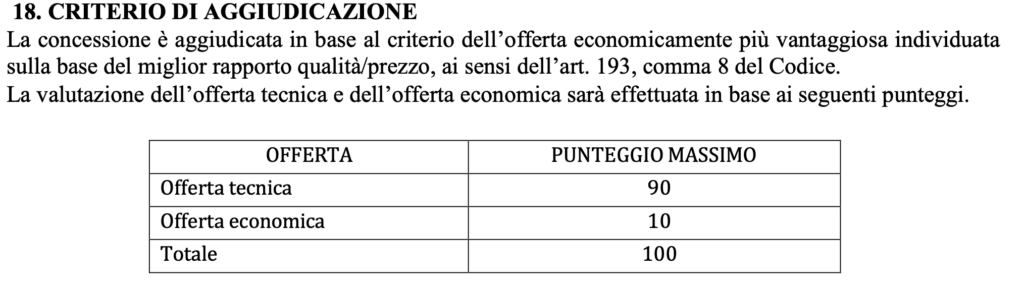 Facciamo un esempio aritmetico che solo apparentemente può sembrare complicato. Offerta economica: se il concorrente A offre 50mila euro annui di canone, gli vengono assegnati 10 punti, se il concorrente B offre invece 15.001 euro ottiene 1,5 punti. Quindi tra A e B ci sarebbe un divario di appena 8,5 punti, nonostante l’offerta del concorrente A sia molto più vantaggiosa per il comune, in quando garantirebbe un’entrata complessiva di 500mila euro per i 10 anni di concessione. Offerta tecnica: l’unico criterio quantitativo (oggettivo) attribuisce soltanto 10 punti. I restanti 90 punti vengono assegnati in modo discrezionale (soggettivo) dalla commissione. In buona sostanza, il punteggio attribuito ai partecipanti con criteri oggettivi è talmente basso che non potrà mai incidere in modo determinante sull’esito dell’appalto: il vincitore sarà decretato sulla base di una valutazione soggettiva dei commissari di gara (foto in basso).
