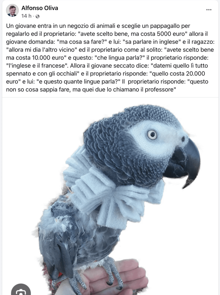 Per mettere in ridicolo il suo ormai ex collega dell’esecutivo, il braccio destro del sindaco e suo accompagnatore ufficiale pubblica una barzelletta nonostante, come già detto, ad Aversa non ci sia proprio nulla da ridere. Ecco il testo integrale del post di Oliva, inclusi gli errori di punteggiatura. “Un giovane entra in un negozio di animali e sceglie un pappagallo per regalarlo ed il proprietario: “avete scelto bene, ma costa 5000 euro” allora il giovane domanda: “ma cosa sa fare?” e lui: “sa parlare in inglese” e il ragazzo: “allora mi dia l’altro vicino” ed il proprietario come al solito: “avete scelto bene ma costa 10.000 euro” e questo: “che lingua parla?” il proprietario risponde: “l’inglese e il francese”. Allora il giovane seccato dice: “datemi quello lì tutto spennato e con gli occhiali” e il proprietario risponde: “quello costa 20.000 euro” e lui: “e questo quante lingue parla?” Il proprietario risponde: “questo non so cosa sappia fare, ma quei due lo chiamano il professore”.