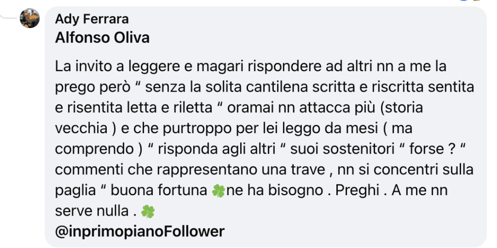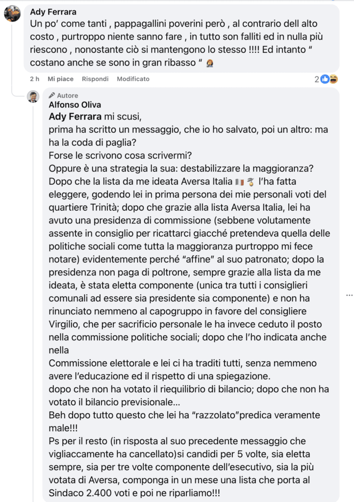 Al netto dei pochi “mi piace” cliccati dagli ancora più sparuti seguaci di Oliva, orami condottiero di sé stesso, tra i commenti spicca quello autorevole della consigliera comunale di maggioranza Adele Ferrara, intervenuta per difendere l’assessore dimissionario. “Un po’ come tanti – scrive Ferrara -, pappagallini poverini però, al contrario dell’alto costo, purtroppo niente sanno fare, in tutto sono falliti ed in nulla più riescono, nonostante ciò si mantengono lo stesso. Ed intanto costano anche se sono in gran ribasso”, ha scritto l’esponente della coalizione targata Matacena (foto in basso). Avendo toccato diversi nervi scoperti, non si è fatta attendere la risposta di Oliva che, dopo aver rinfacciato a Ferrara di aver rimosso un precedente commento da lei pubblicato, ha duramente attaccato la consigliera anche sul piano personale: “Dopo che grazie alla lista Aversa Italia lei ha avuto una presidenza di commissione, è stata volutamente assente in consiglio per ricattarci giacché pretendeva quella delle Politiche sociali come tutta la maggioranza purtroppo mi fece notare) evidentemente perché “affine” al suo patronato” (foto in basso). Ed ecco riaffiorare nella maggioranza il termine “ricatto”. Prima o poi qualcuno dovrà fare chiarezza su questo delicatissimo punto, quello dei “ricatti e dei condizionamenti”, di cui ha parlato a mezzo stampa anche Matacena e la cui spiegazione in assise non ha convinto per nulla l’opposizione. Nel suo commento Oliva rincara la dose contro Ferrara: “Dopo la presidenza, non paga di poltrone, sempre grazie alla lista da me ideata, è stata eletta componente (unica tra tutti i consiglieri comunali ad essere sia presidente sia componente) e non ha rinunciato nemmeno al capogruppo in favore del consigliere Virgilio, che per sacrificio personale le ha invece ceduto il posto nella commissione politiche sociali; dopo che l’ho indicata anche nella Commissione elettorale e lei ci ha traditi tutti, senza nemmeno avere l’educazione ed il rispetto di una spiegazione”. Risoluta la controrisposta di Ferrara: “La invito a leggere e magari rispondere ad altri non a me la prego però “senza la solita cantilena scritta e riscritta sentita e risentita letta e riletta”, oramai non attacca più (storia vecchia) e che purtroppo per lei leggo da mesi (ma comprendo) “risponda agli altri” suoi sostenitori “forse?” commenti che rappresentano una trave, non si concentri sulla paglia ” buona fortuna 2 ne ha bisogno. Preghi. A me non serve nulla” (foto in basso).