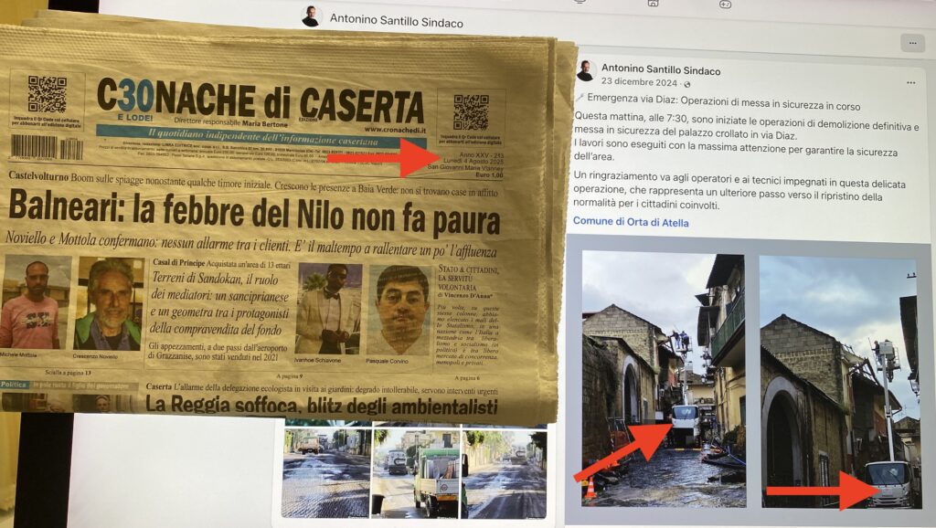 Dimostrando poca dimestichezza anche con i social, oltre che con l’attività amministrativa da mesi completamente ferma al palo, Santillo ha dimenticato di taroccare anche la seconda foto postata, dalla quale si evince chiaramente che l’automezzo in azione in via Diaz è di proprietà della Opus Art. Sulla seconda foto infatti spicca il logo della ditta raggiunta da interdittiva antimafia. Per dimostrare il goffo tentativo di Santillo di cancellare le prove contenute nell’articolo di Italia Notizie pubblichiamo una foto scattata oggi che ritrae la prima pagina dei Cronache di Caserta e il profilo Fb della fascia tricolore, in cui si può leggere la data di oggi 4 agosto 2025 (foto in basso). Basta fare un rapido raffronto con le immagini postate da Santillo in precedenza per comprendere che il sindaco ha tentato di nascondere la verità. Nemmeno Fantozzi avrebbe agito così (foto in basso).