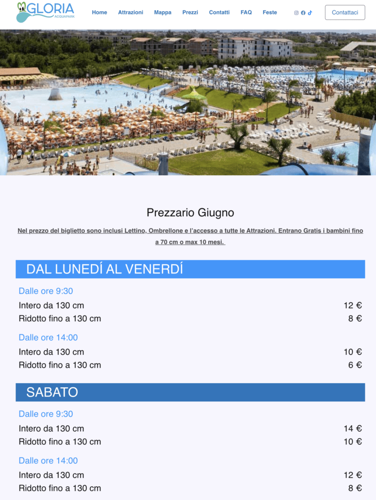IL TARIFFARIO DEL GLORIA VILLAGE