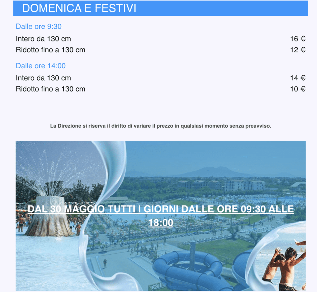 In base al tariffario del Gloria Village, presente sul sito web al momento in cui scriviamo, i cesani adulti risparmieranno appena 3 euro a biglietto per l’ingresso di mattina e appena un euro per entrare di pomeriggio. Infatti l’accesso alla struttura senza sconti ammonta a 12 euro a persona di mattina e a 10 euro di pomeriggio (ultima foto in basso). Ma perché la riduzione non riguarda anche i sabati e le domeniche? Perché entrare sabato e domenica costerebbe rispettivamente 14 e 16 euro. Quindi i gestori ci avrebbero rimesso sull’incasso totale, alias avrebbero guadagnato meno. Per gli “adulti e minori disabili ai sensi della legge 104/1992 art. 3 comma 3”, come si legge anche nella delibera, “la riduzione prevede un costo del biglietto di 6 euro a persona”, sempre soltanto dal lunedì al venerdì ed escluso il periodo dal 4 agosto al 16 agosto. In questo caso il risparmio è consistente ma sarebbe stata cosa buona e giusta, per aiutare le fasce sociali particolarmente deboli, prevedere l’esenzione totale appostando fondi comunali per coprire i costi.