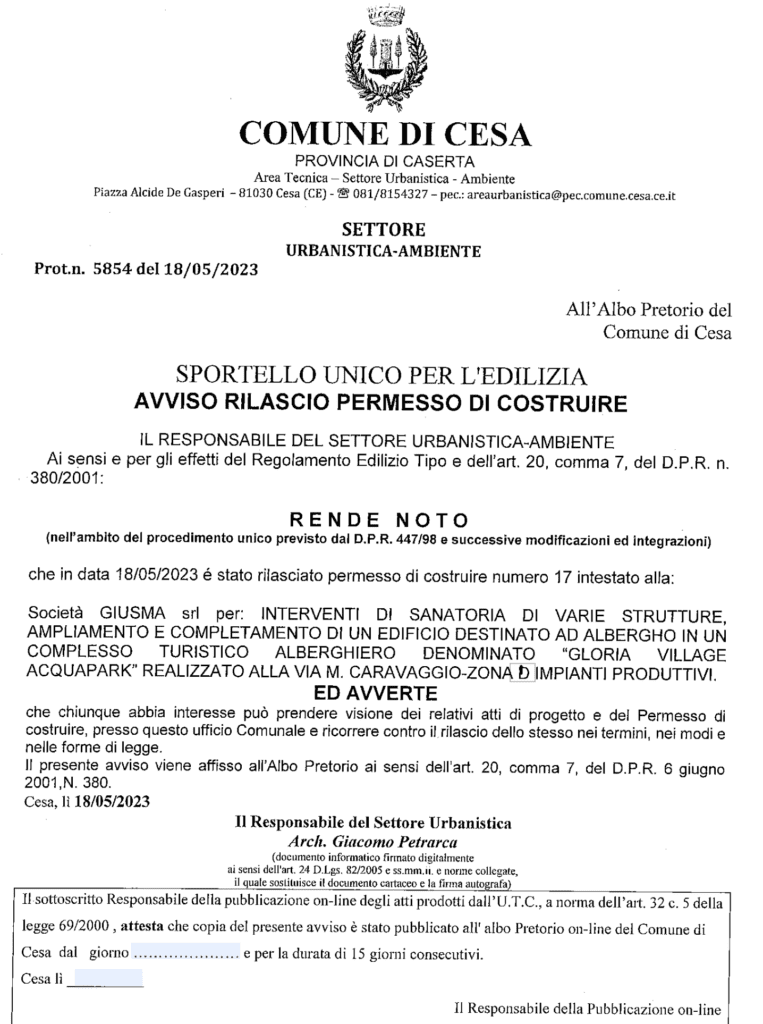 Tre mesi prima, il 17 maggio 2023, la giunta diede l’ok alla monetizzazione degli standard urbanistici di “un edificio destinato ad albergo in un complesso turistico alberghiero denominato Gloria Village Acquapark”. Importo: 68mila euro (link in basso). Non mettiamo in dubbio i calcoli del funzionario Giacomo Petrarca, ma ad occhio ci sembra pochino. Ma, per carità, la matematica non è un’opinione. Il 18 maggio 2023, un giorno dopo il provvedimento dell’esecutivo, l’ufficio tecnico di Cesa rilasciò inoltre la licenza in sanatoria alla società degli Smarrazzo per “ampliamento e completamento del Gloria Village (foto in basso). Nel 2024 la struttura ha riaperto i battenti. E anche allora Guida sottoscrisse la convenzione con parco acquatico sui prezzi agevolati per i residenti. Quest’anno idem. Come detto, Salvatore Smarrazzo dichiarò che “il comune di Cesa è più ricco”. Peccato che se ne siano accorti soltanto in pochissimi.