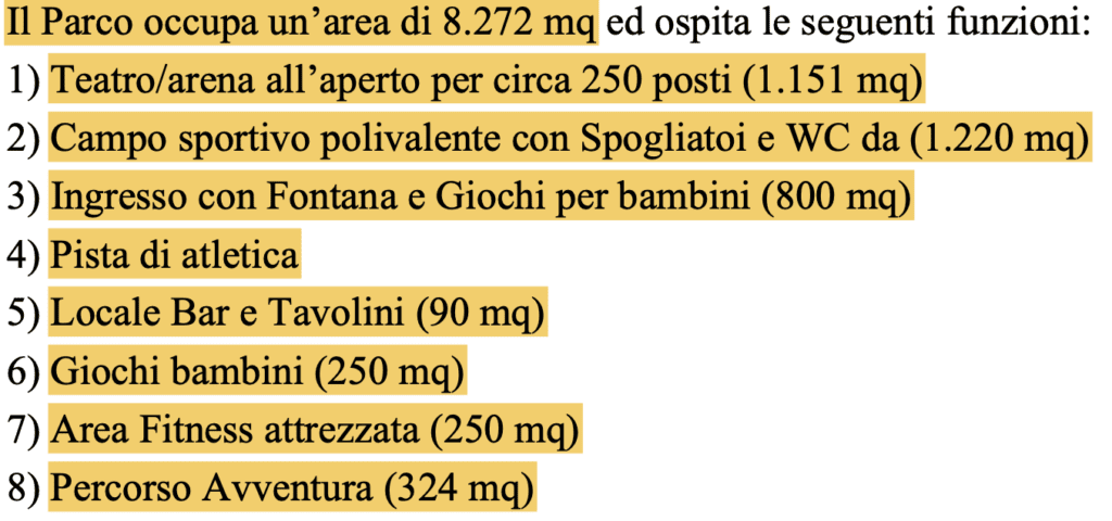 A rendere ancora più indigesto il brutto scherzo c’è lo stanziamento di 800mila euro di soldi pubblici, cioè dei cittadini, per la realizzazione del parco. Qui si segue un altro filone già ampiamente sperimentato durante i 10 anni di gestione Guida: l’amministrazione spende ingenti somme di denaro pubblico, i privati ci guadagnano investendo le briciole. La struttura che sarà esternalizzata ospiterà un teatro-arena all’aperto con circa 250 posti su un’area di 1.151 mq, un campo sportivo polivalente con spogliatoi di 1.220 mq, giochi per bambini su due aree, una di 800 mq, l’altra di 250 mq, una pista di atletica, una zona fitness attrezzata di 250 mq, un percorso avventura di 324 mq e un bar con tavolini di 90 mq.