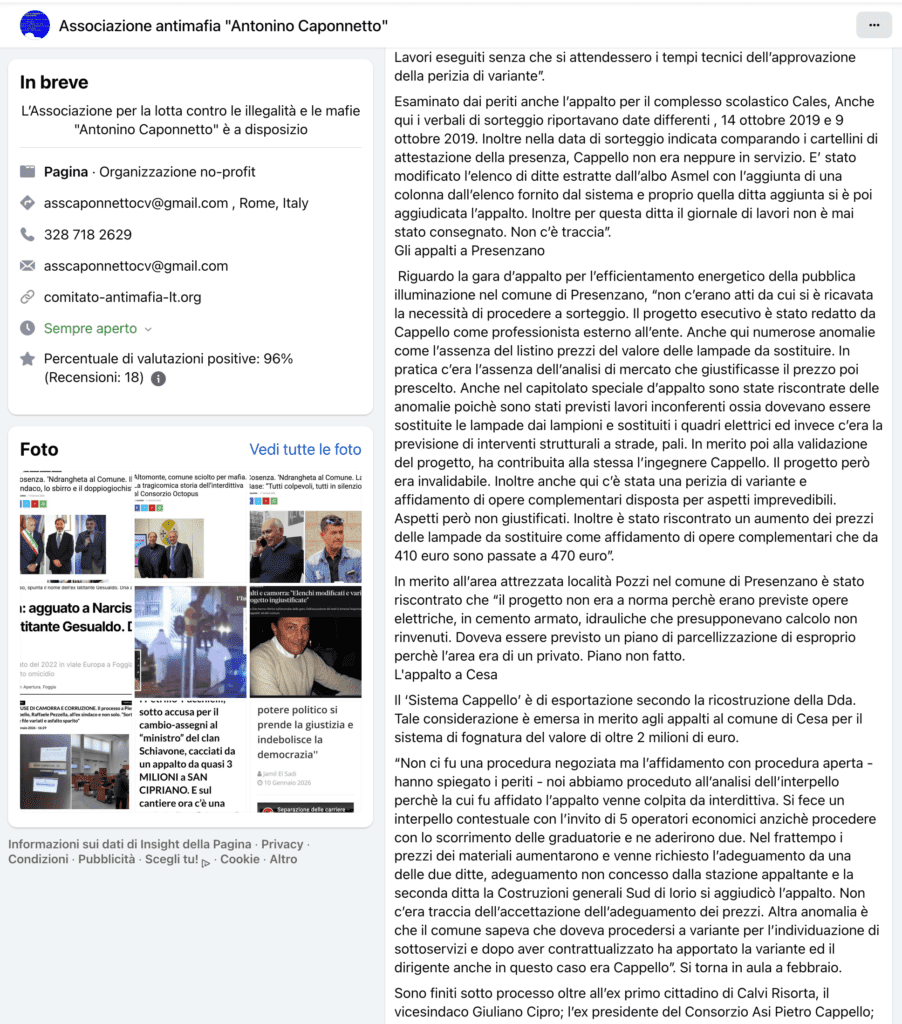 Altro che solo cose belle. Il comune di Cesa finisce sulla pagina Fb dell’associazione antimafia Antonino Caponnetto per l’appalto da oltre 2 milioni di euro per la rete fognaria (clicca qui per il link e foto in basso). Il sodalizio, noto e apprezzato in tutt’Italia per il suo impegno contro la criminalità organizzata, lo scorso 12 gennaio ha pubblicato un post con gli esiti delle perizie dei consulenti del pm Maurizio Giordano della Dda di Napoli, nell’ambito del processo a carico dell’ex sindaco di Calvi Risorta Giovanni Rosario Lombardi e di altre 12 persone coinvolte nell’inchiesta su appalti truccati e somme di denaro distratte per eludere le disposizioni antimafia. Tra gli imputati figura Piero Cappello, poi assunto a Cesa e dove tuttora è funzionario. Dinanzi alla terza sezione del tribunale di Santa Maria Capua Vetere, presieduta da Luciana Crisci con a latere Valerio Riello e Luca Vitale, i due periti hanno passato al vaglio diversi appalti aggiudicati a Calvi Risorta, Presenzano e Cesa.