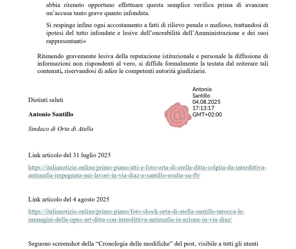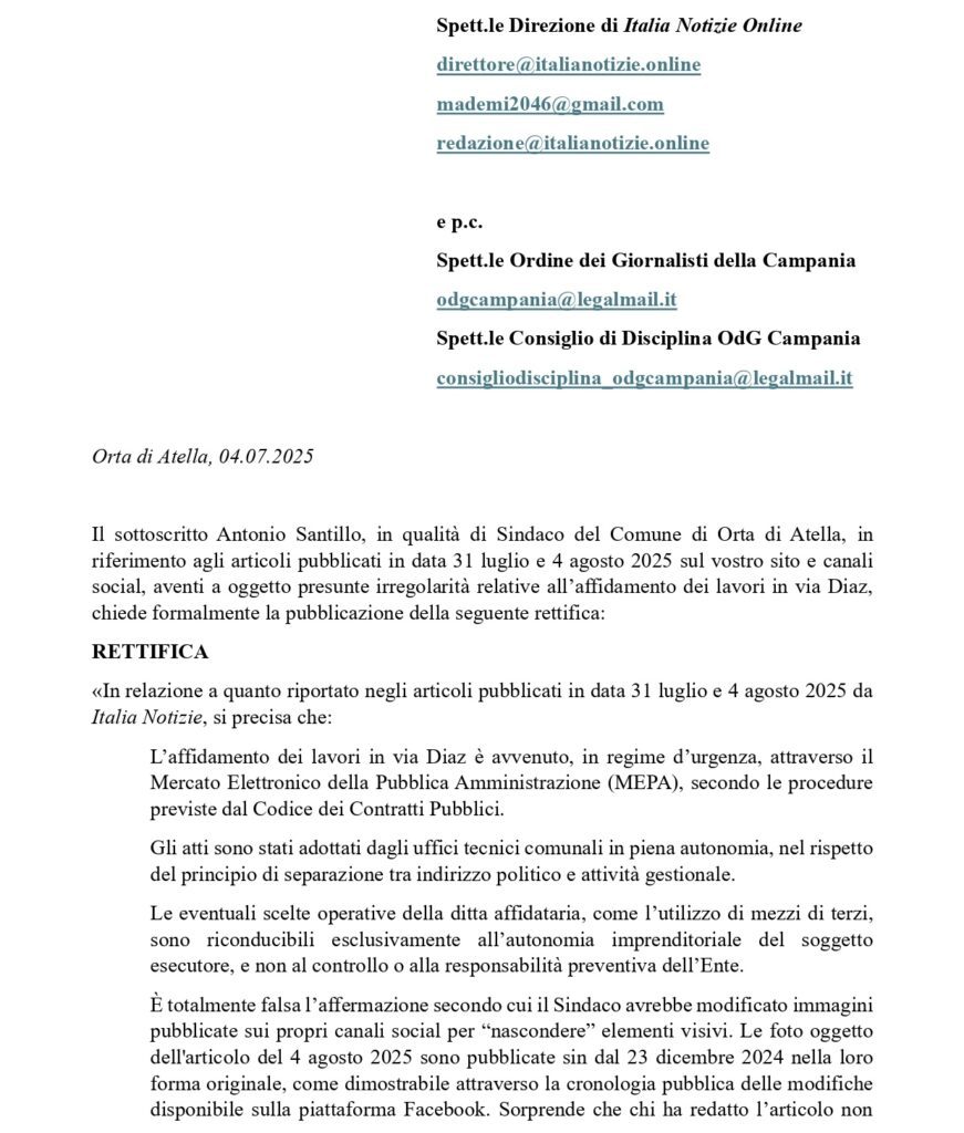 Riceviamo e volentieri pubblichiamo la rettifica del sindaco di Orta di Atella Antonino Santillo in riferimento agli articoli pubblicati il 31 luglio e 4 agosto 2025 su Italia Notizie sull’appalto diretto da 52mila euro alla ditta Costruendo per i lavori di via Diaz e sulla presenza sul cantiere dei mezzi della società Opus Art, colpita da interdittiva antimafia (clicca qui per il primo articolo, clicca qui per il secondo). Ecco il testo integrale inviatoci dal primo cittadino. “Si precisa che: l’affidamento dei lavori in via Diaz è avvenuto, in regime d’urgenza, attraverso il Mercato Elettronico della Pubblica Amministrazione (MEPA), secondo le procedure previste dal Codice dei Contratti Pubblici. Gli atti sono stati adottati dagli uffici tecnici comunali in piena autonomia, nel rispetto del principio di separazione tra indirizzo politico e attività gestionale. Le eventuali scelte operative della ditta affidataria, come l’utilizzo di mezzi di terzi, sono riconducibili esclusivamente all’autonomia imprenditoriale del soggetto esecutore, e non al controllo o alla responsabilità preventiva dell’Ente. È totalmente falsa l’affermazione secondo cui il Sindaco avrebbe modificato immagini pubblicate sui propri canali social per “nascondere” elementi visivi. Le foto oggetto dell’articolo del 4 agosto 2025 sono pubblicate sin dal 23 dicembre 2024 nella loro forma originale, come dimostrabile attraverso la cronologia pubblica delle modifiche disponibile sulla piattaforma Facebook. Sorprende che chi ha redatto l’articolo non abbia ritenuto opportuno effettuare questa semplice verifica prima di avanzare un’accusa tanto grave quanto infondata. Si respinge infine ogni accostamento a fatti di rilievo penale o mafioso, trattandosi di ipotesi del tutto infondate e lesive dell’onorabilità dell’Amministrazione e dei suoi rappresentanti”.