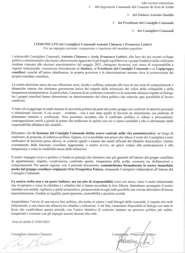 Ci arrendiamo. Abbiamo letto e riletto con la massima attenzione una decina di volte il documento di Francesco Lettieri e Antonio Chianese ma, per onestà intellettuale e culturale, siamo costretti ad ammettere che non ci abbiamo capito nulla. Quello che l’universo mondo si attendeva dai due consiglieri comunali, ovvero se fanno ancora parte della maggioranza o se sono passati all’opposizione, resta un mistero. Almeno per noi. Se qualche lettore o cittadino è riuscito a svelare l’arcano ce lo faccia sapere. Gliene saremo eternamente grati. Nemmeno l’Aldo Moro delle “convergenze parallele” sarebbe stato più criptico sul punto cruciale della faccenda, appunto la collocazione in assise di Lettieri e Chianese. In attesa di squarciare il velo di Maya quello che emerge con chiarezza assoluta dal documento sono due aspetti. Il primo di natura politica: l’addio al gruppo Prospettiva Futura per Orta, adesso composto soltanto dagli eletti nella lista Coraggio. Il secondo di tipo giudiziario: alcune decisioni amministrative sarebbero state prese “altrove, in contesti opachi”. Beh, dopo un’affermazione per iscritto così grave ci auguriamo che i due membri dell’assise si siano recati seduta stante presso la caserma dei carabinieri di Orta di Atella per andare nello specifico e denunciare i singoli fatti. Nella veste di consiglieri comunali, Lettieri e Chianese sono dei pubblici ufficiali. È il minimo che possano, anzi debbano fare per rispettare “l’impegno coerente, trasparente e rispettoso del mandato popolare”.