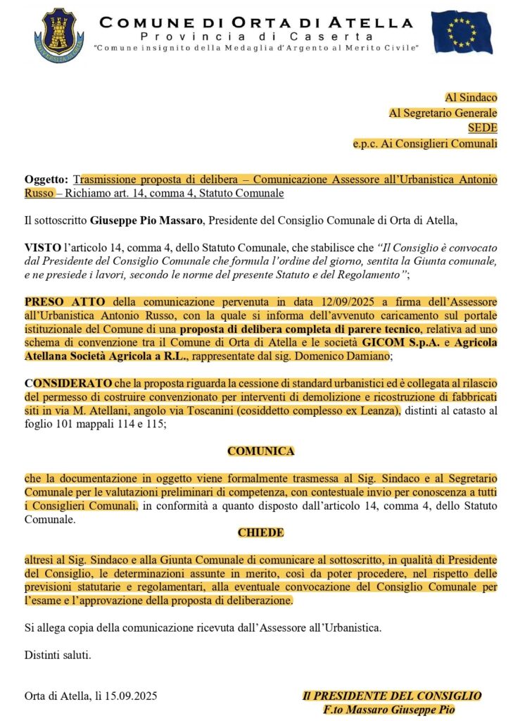 E forse proprio perché di tempo ne è rimasto davvero poco, ecco spuntare una proposta di delibera caricata sul portale istituzionale dell’ente per la stipula della “convenzione tra il comune di Orta di Atella e le società Gicom S.p.A. e Agricola Atellana Società Agricola a.rl., rappresentate dal sig. Domenico Damiano” (foto in basso). L’esistenza della proposta di delibera è stata comunicata lo scorso 12 settembre dall’assessore all’Urbanistica Tonino Russo (lista Coraggio) al presidente dell’assise Massaro, che a sua volta l’ha inviata al sindaco, al segretario comunale e a tutti i consiglieri. “La proposta – si legge nella nota di Massaro – riguarda la cessione di standard urbanistici ed è collegata al rilascio del permesso di costruire convenzionato per interventi di demolizione e ricostruzione di fabbricati siti in via Martiri Atellani, angolo via Toscanini (cosiddetto complesso ex Leanza)”.