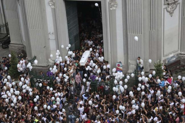 Lanterne cinesi liberate in aria e palloncini bianchi hanno salutato Genny Cesarano al termine dei funerali nella chiesa di San Vincenzo alla Sanità. Gli amici del ragazzo, decine e decine di giovani che indossavano una t-shirt con la sua foto, hanno scritto dediche sulle lanterne cinesi fatte volare in aria. All’uscita della bara decine di palloncini bianchi hanno accompagnato il volo delle lanterne. Applausi ripetuti da parte della folla che non ha trovato posto all’interno della chiesa, cresciuta fino a oltre 1000 persone. “Il nostro quartiere resterà a lutto fino a quando non ci sarà una risposta dalle istituzioni su quello che è accaduto a Genny Cesarano”. Questo l’annuncio del parroco della chiesa di San Vincenzo alla Sanità, don Antonio Loffredo, al termine dei funerali del ragazzo ucciso da un colpo di pistola la notte del 5 settembre. “Vi invito a esporre un fiocco nero e uno viola alle vostre case – ha aggiunto il sacerdote – e a restare a lutto fino ad allora”. Dalle finestre delle case vicine alla chiesa sono cominciati a spuntare drappi neri a lutto come richiesto dal parroco don Antonio Loffredo.