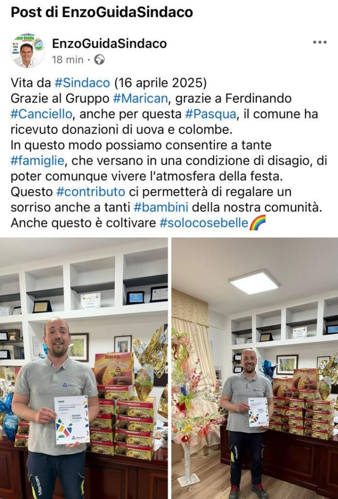 Arriviamo allo scorso 19 aprile. In occasione delle festività pasquali il sindaco di Cesa posta sui social un altro accorato ringraziamento: “Grazie al Gruppo #Marican, grazie a Ferdinando #Canciello, anche per questa #Pasqua, il comune ha ricevuto donazioni di uova e colombe. In questo modo possiamo consentire a tante #famiglie, che versano in una condizione di disagio, di poter comunque vivere l’atmosfera della festa. Questo #contributo ci permetterà di regalare un sorriso anche a tanti #bambini della nostra comunità. Anche questo è coltivare #solocosebelle”. Un po’ di elemosina da parte del costruttore del Conad in via Martiri Atellani, Ferdinando Canciello, appunto, viene dipinta da Guida come una donazione magniloquente da sbandierare ai quattro venti (clicca qui e post in basso). Vabbè, siamo in campagna elettorale per le comunali 2026 e tutto fa brodo.